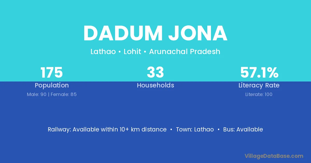 The literacy rate of Dadum Jona village is 57.14%. Male literacy stands at 72.22% and female literacy at 41.18%.