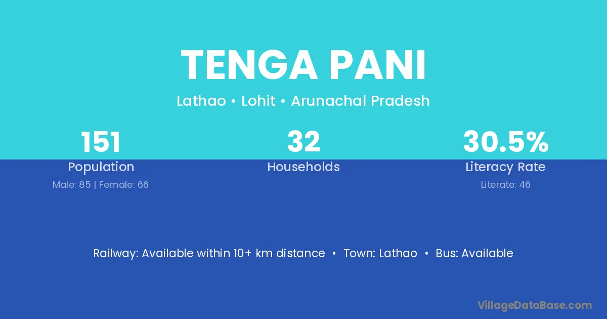 The literacy rate of Tenga Pani village is 30.46%. Male literacy stands at 36.47% and female literacy at 22.73%.