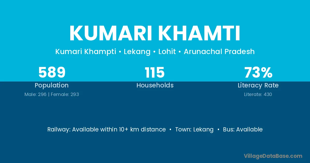 Kumari Khamti village has a total population of 589 people, of which 296 are males and 293 are females.