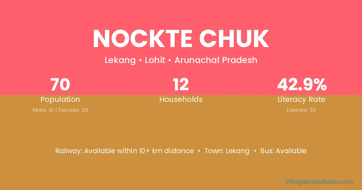 The literacy rate of Nockte Chuk village is 42.86%. Male literacy stands at 46.34% and female literacy at 37.93%.