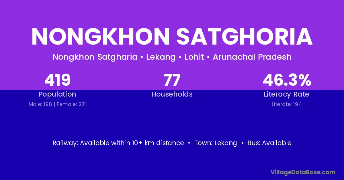 Nongkhon Satghoria village has a total population of 419 people, of which 198 are males and 221 are females.