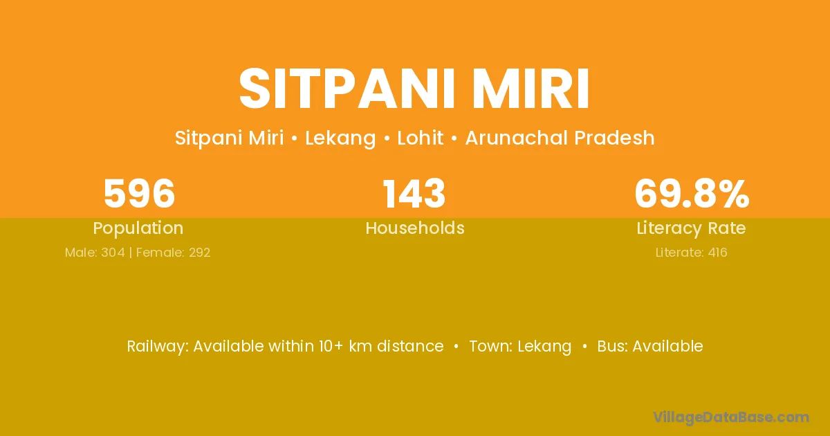 Sitpani Miri village has a total population of 596 people, of which 304 are males and 292 are females.