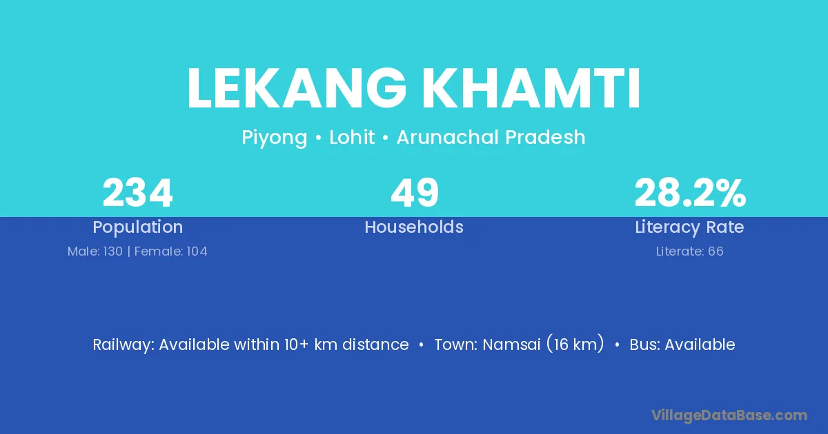 Namsai (16 km) is the nearest town to Lekang Khamti village for major economic activities and is located approximately 16 km away.