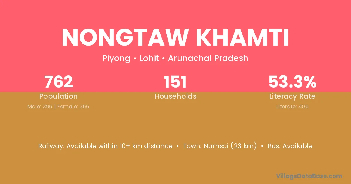 Nongtaw Khamti village has a total population of 762 people, of which 396 are males and 366 are females.