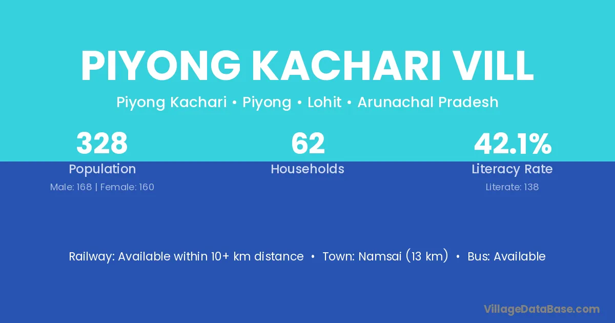 Namsai (13 km) is the nearest town to Piyong Kachari Vill village for major economic activities and is located approximately 13 km away.