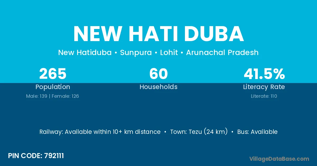 Tezu (24 km) is the nearest town to New Hati Duba village for major economic activities and is located approximately 24 km away.