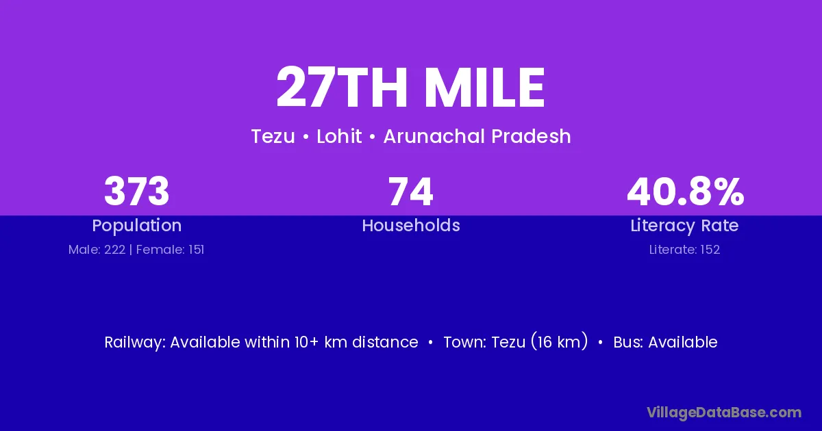Tezu (16 km) is the nearest town to 27th Mile village for major economic activities and is located approximately 16 km away.