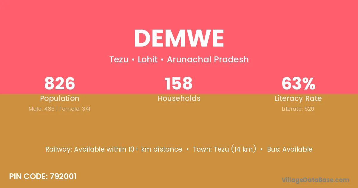 Tezu (14 km) is the nearest town to Demwe village for major economic activities and is located approximately 14 km away.