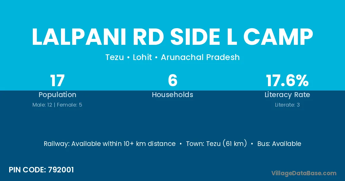 Tezu (61 km) is the nearest town to Lalpani Rd Side L Camp village for major economic activities and is located approximately 61 km away.
