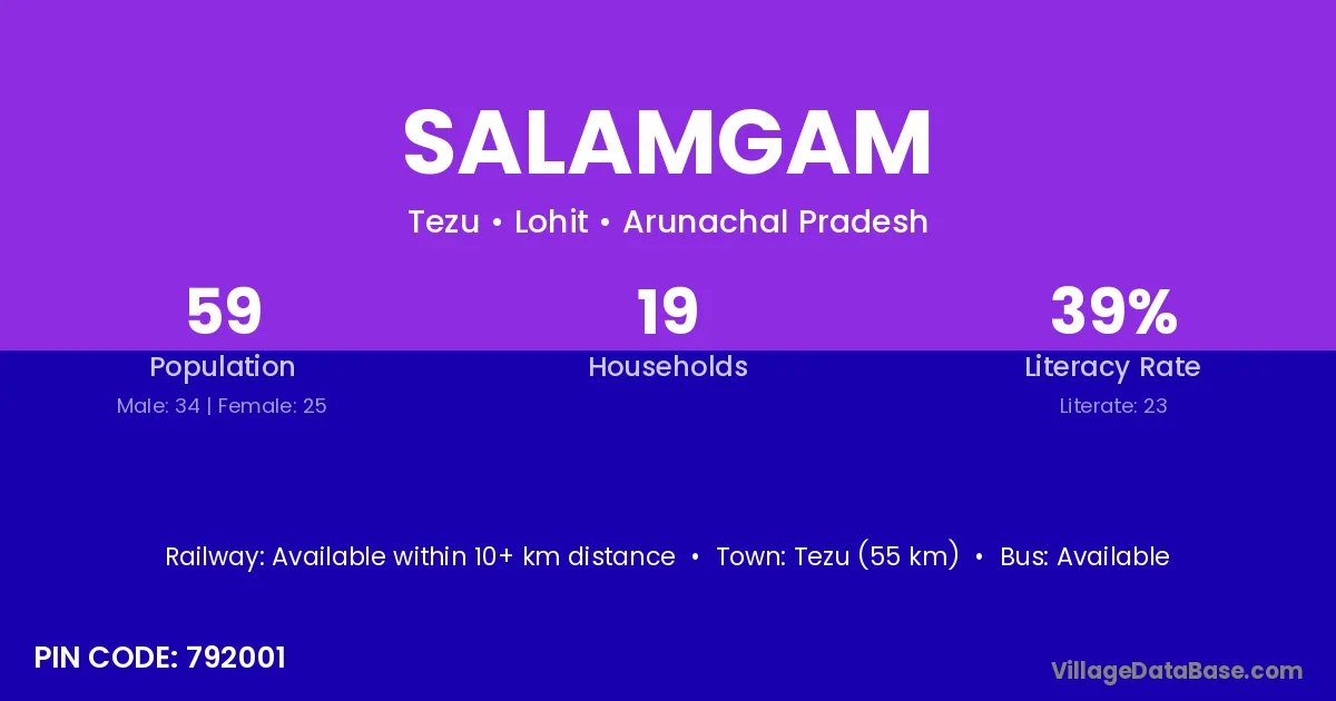Tezu (55 km) is the nearest town to Salamgam village for major economic activities and is located approximately 55 km away.