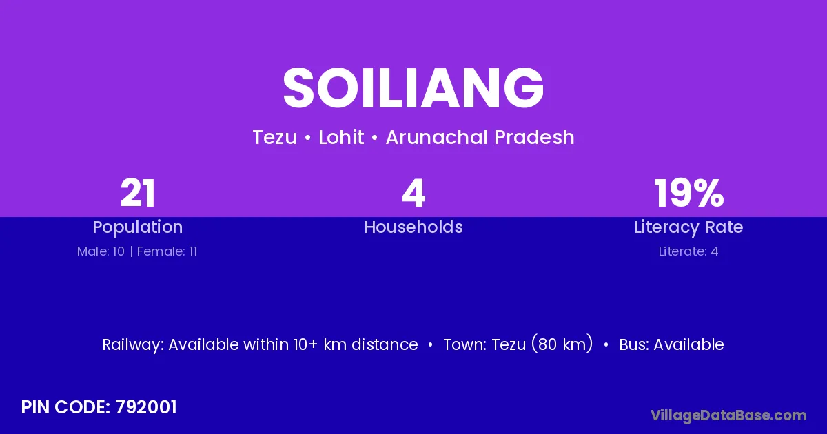 Tezu (80 km) is the nearest town to Soiliang village for major economic activities and is located approximately 80 km away.