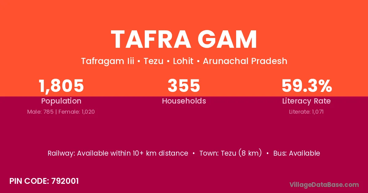 Tezu (8 km) is the nearest town to Tafra Gam village for major economic activities and is located approximately 8 km away.