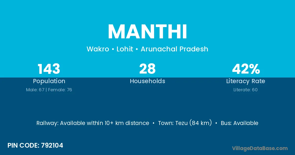 Tezu (84 km) is the nearest town to Manthi village for major economic activities and is located approximately 84 km away.