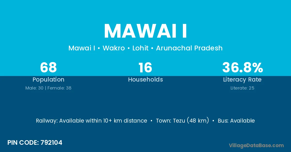 Tezu (48 km) is the nearest town to Mawai I village for major economic activities and is located approximately 48 km away.