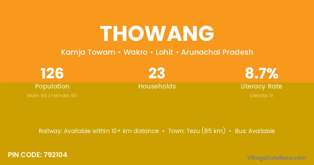 Tezu (85 km) is the nearest town to Thowang village for major economic activities and is located approximately 85 km away.