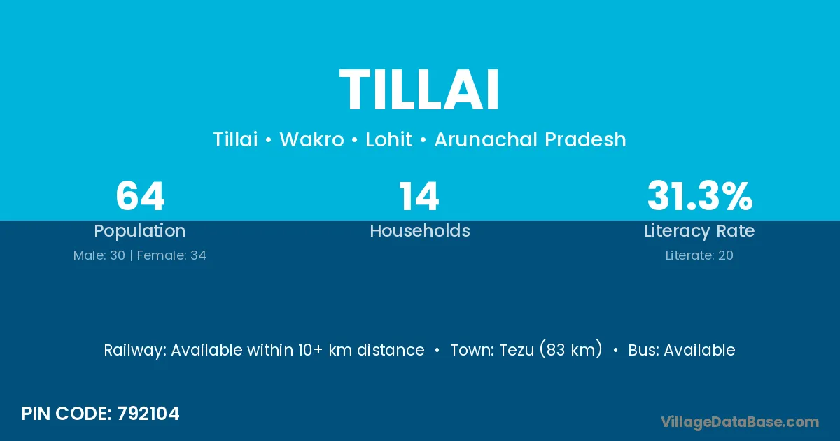 Tezu (83 km) is the nearest town to Tillai village for major economic activities and is located approximately 83 km away.