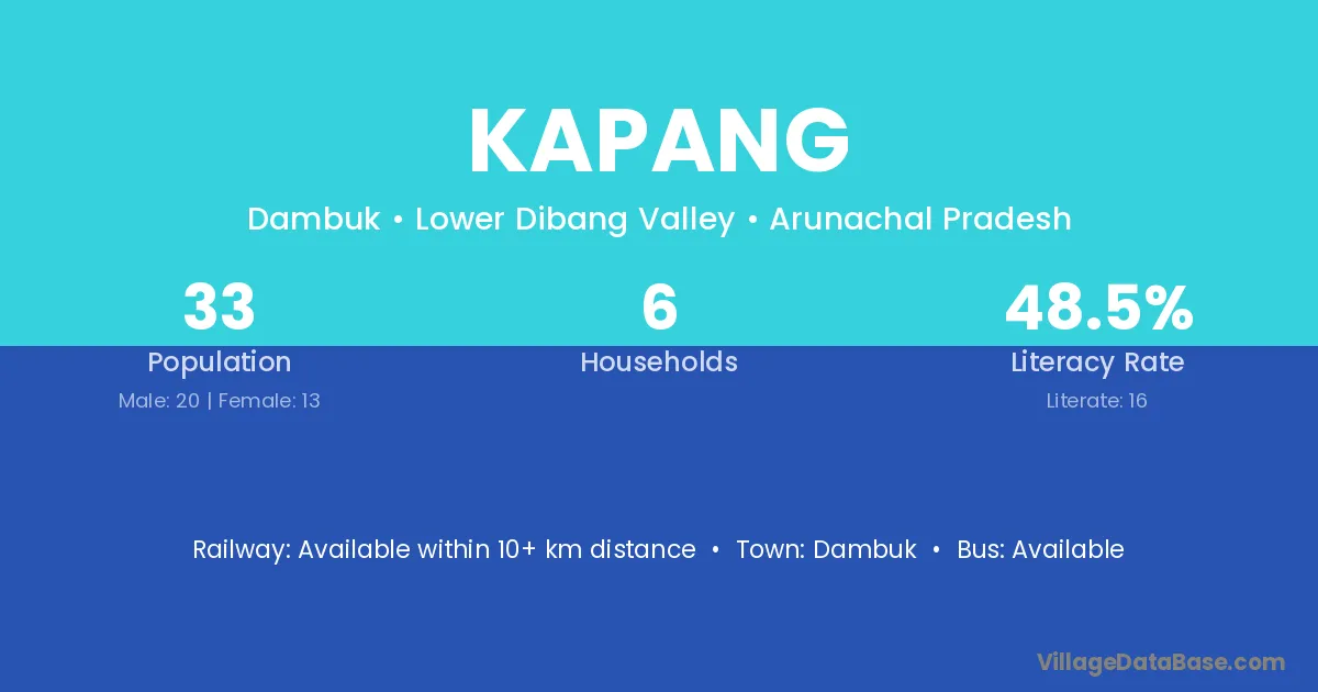 Kapang village has a total population of 33 people, of which 20 are males and 13 are females.