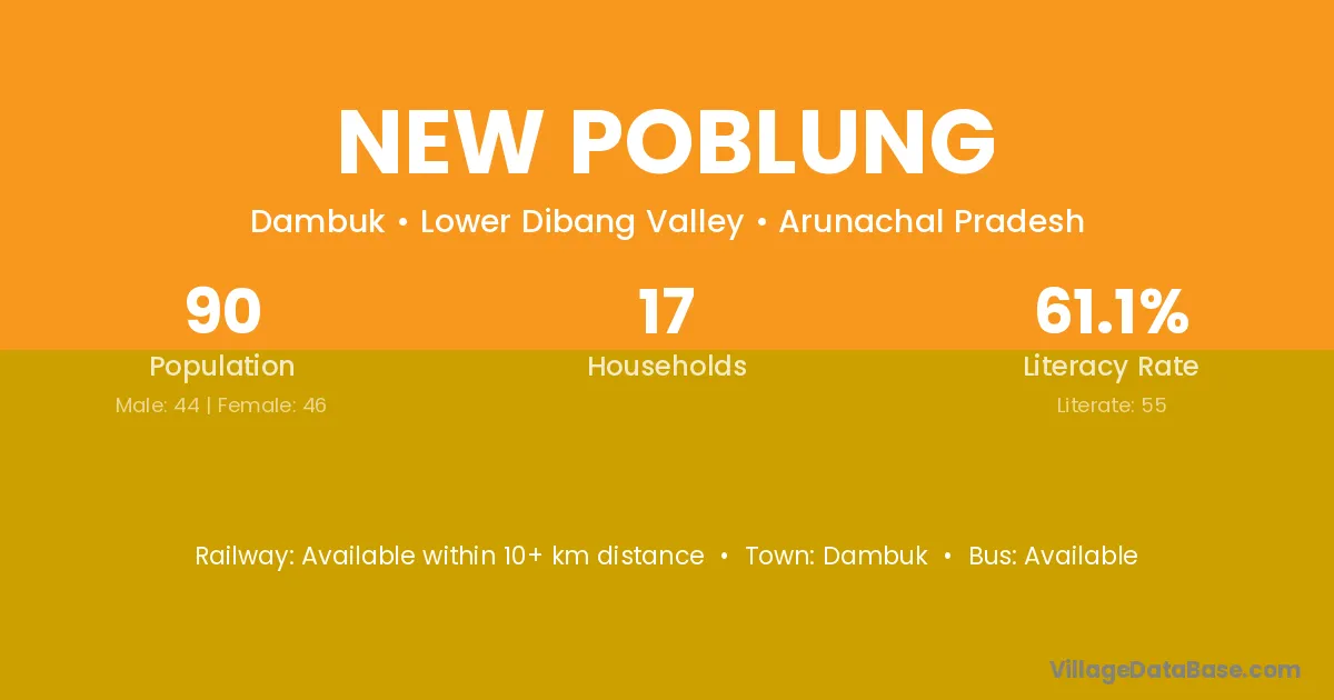 New Poblung village has a total population of 90 people, of which 44 are males and 46 are females.