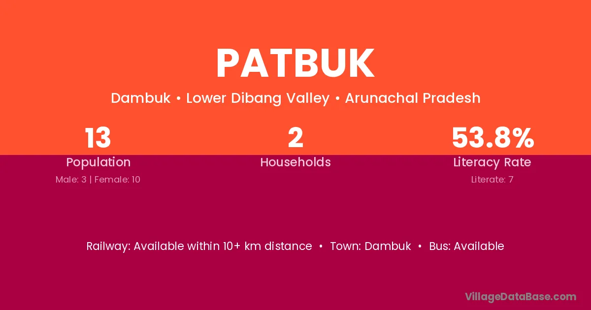 Patbuk village has a total population of 13 people, of which 3 are males and 10 are females.