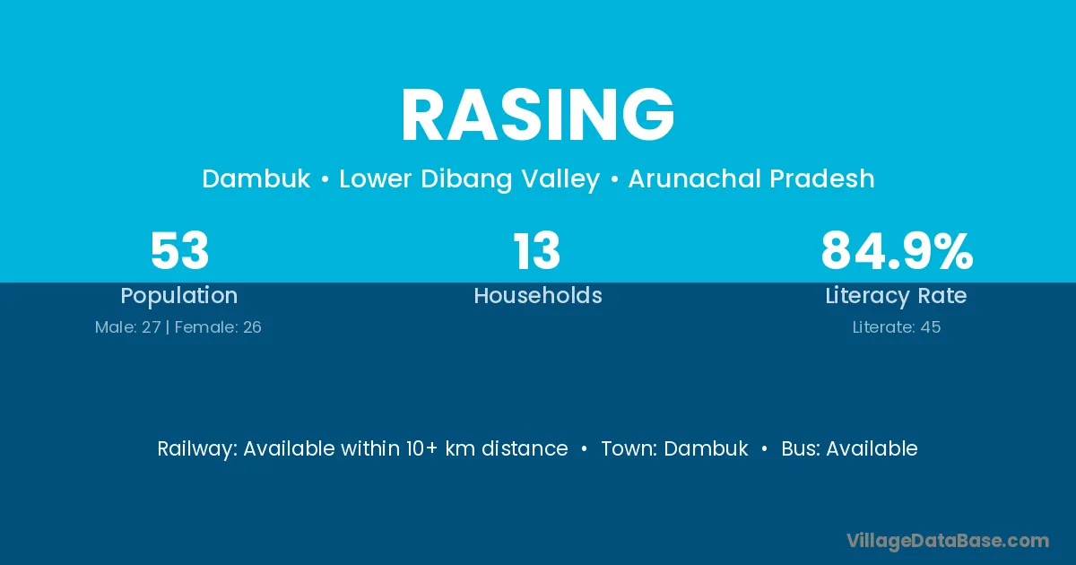 Rasing village has a total population of 53 people, of which 27 are males and 26 are females.
