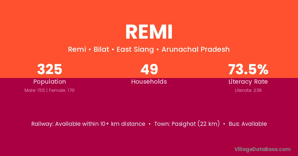 The literacy rate of Remi village is 79.63%. Male literacy stands at 88.41% and female literacy at 70.45%.