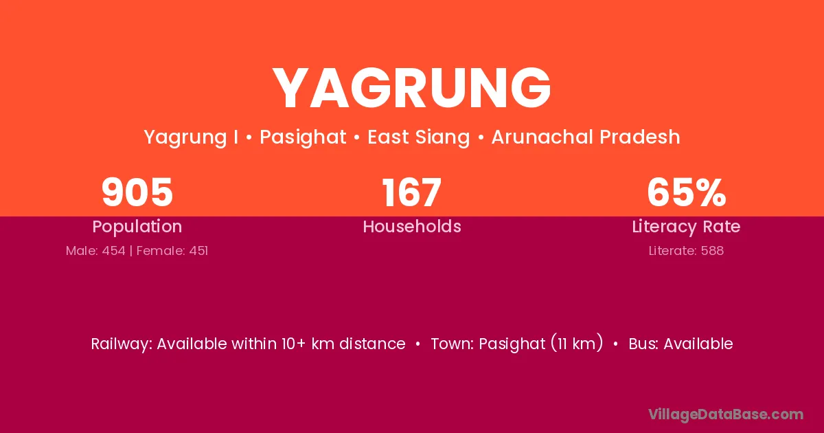The literacy rate of Yagrung village is 24.79%. Male literacy stands at 27.59% and female literacy at 22.03%.