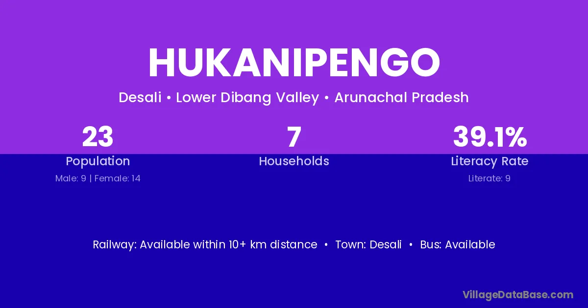 Hukanipengo village has a total population of 23 people, of which 9 are males and 14 are females.