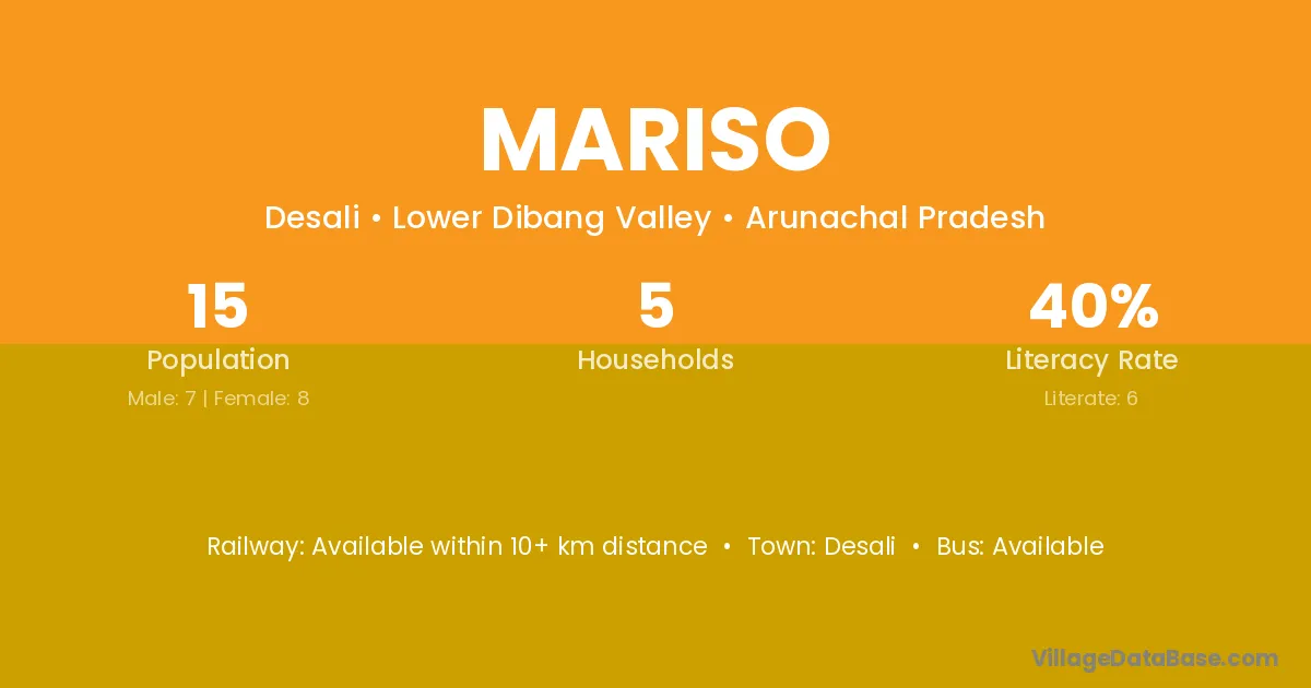 Mariso village has a total population of 15 people, of which 7 are males and 8 are females.