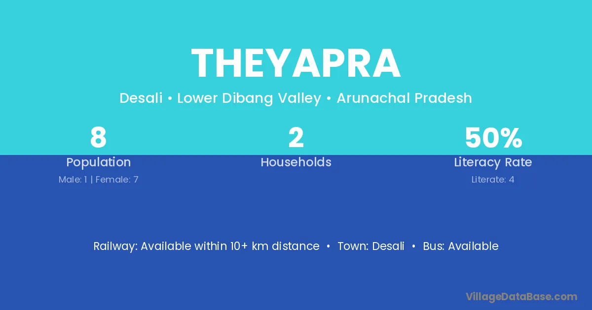 The literacy rate of Theyapra village is 50.00%. Male literacy stands at 0.00% and female literacy at 57.14%.