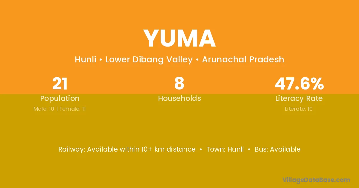 The literacy rate of Yuma village is 47.62%. Male literacy stands at 50.00% and female literacy at 45.45%.