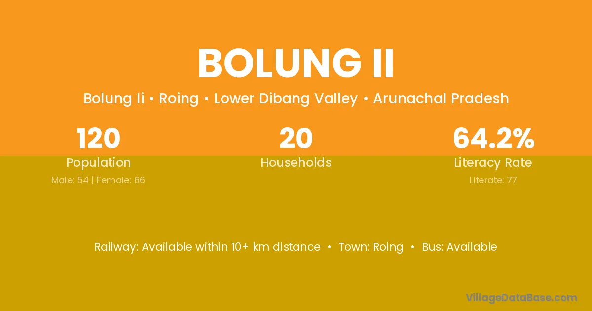 Bolung Ii village has a total population of 120 people, of which 54 are males and 66 are females.