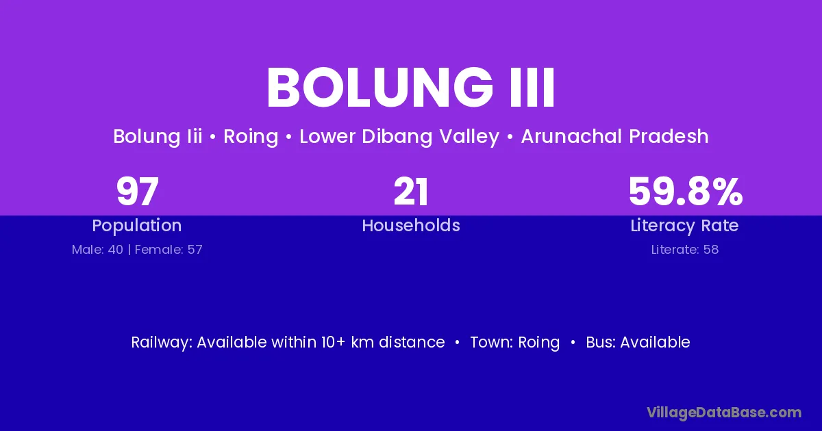 The literacy rate of Bolung Iii village is 59.79%. Male literacy stands at 75.00% and female literacy at 49.12%.