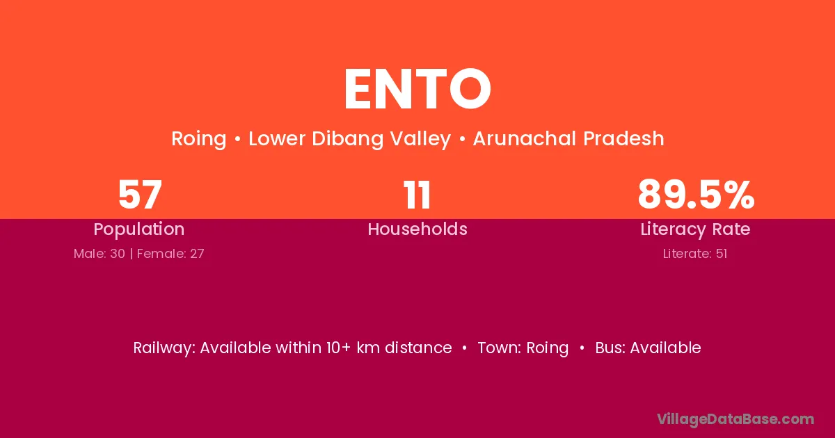 Ento village has a total population of 57 people, of which 30 are males and 27 are females.
