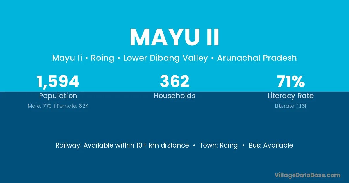 The literacy rate of Mayu Ii village is 70.95%. Male literacy stands at 76.88% and female literacy at 65.41%.