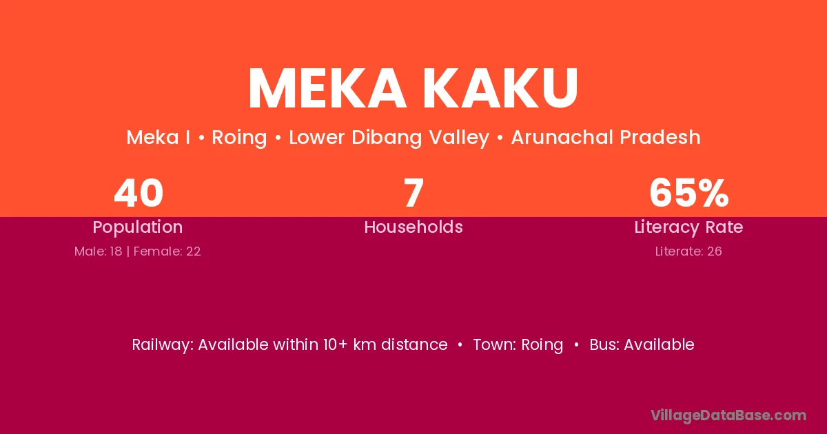 Meka Kaku village has a total population of 40 people, of which 18 are males and 22 are females.