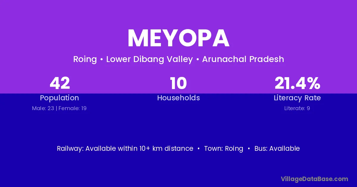 The literacy rate of Meyopa village is 21.43%. Male literacy stands at 30.43% and female literacy at 10.53%.