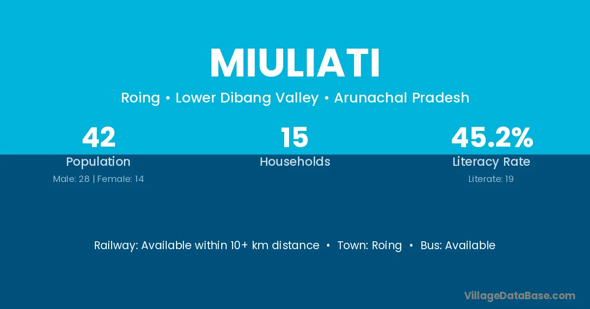 The literacy rate of Miuliati village is 45.24%. Male literacy stands at 42.86% and female literacy at 50.00%.