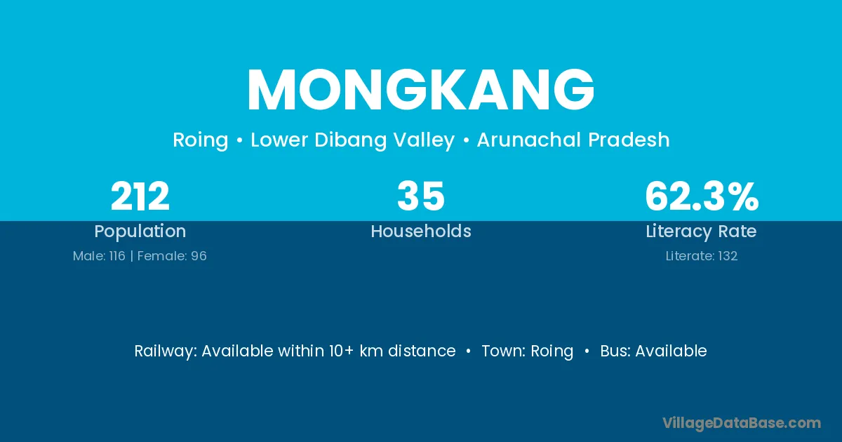 Mongkang village has a total population of 212 people, of which 116 are males and 96 are females.