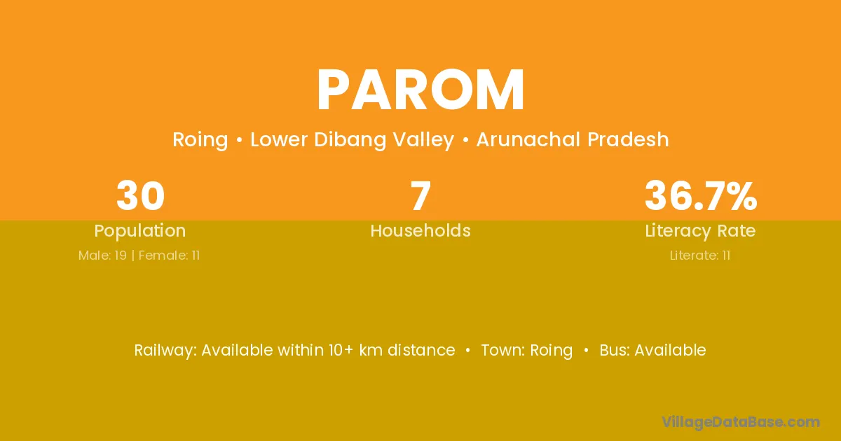 Parom village has a total population of 30 people, of which 19 are males and 11 are females.