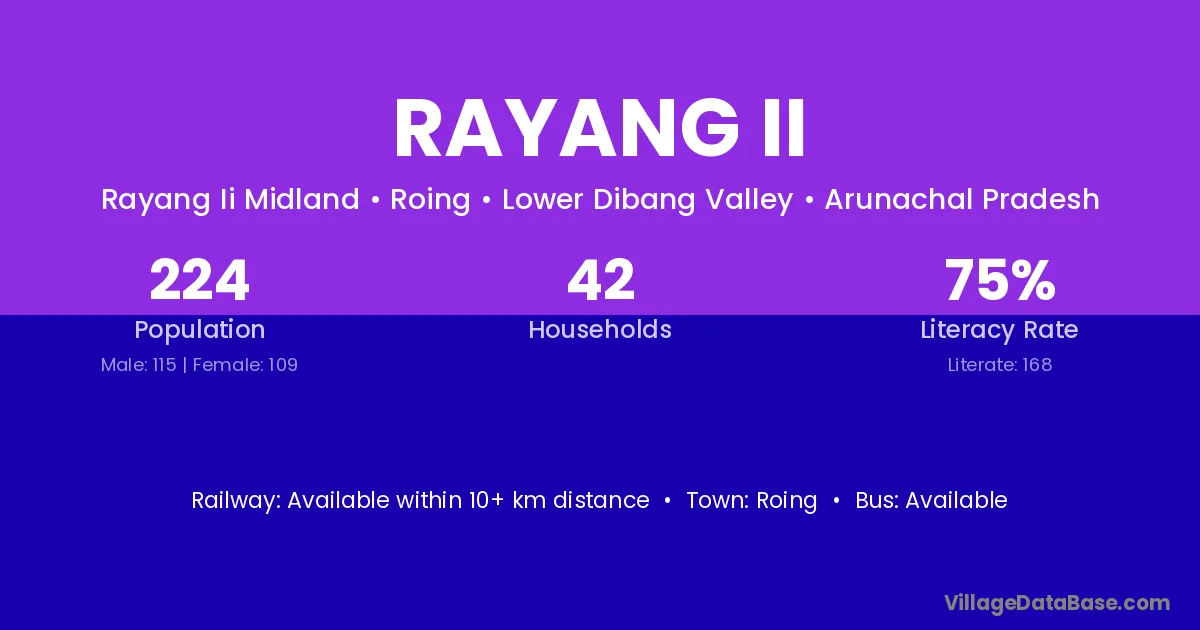 Rayang Ii village has a total population of 224 people, of which 115 are males and 109 are females.
