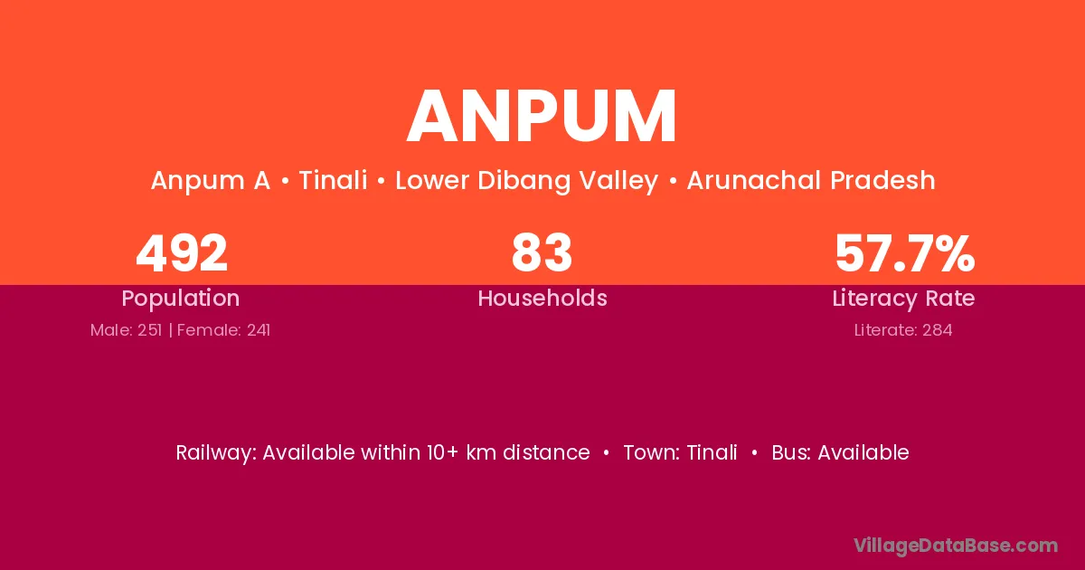 Anpum village has a total population of 492 people, of which 251 are males and 241 are females.