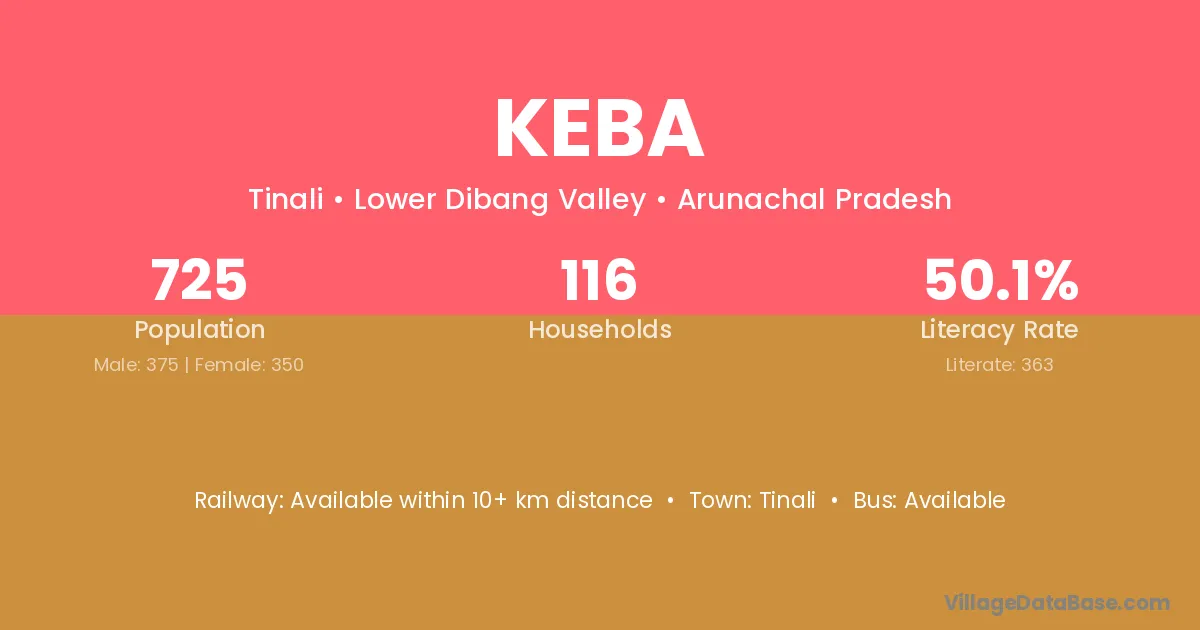 Keba village has a total population of 725 people, of which 375 are males and 350 are females.