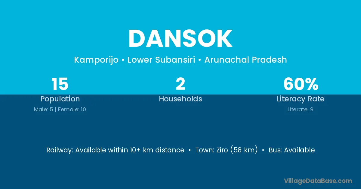 Ziro (58 km) is the nearest town to Dansok village for major economic activities and is located approximately 58 km away.