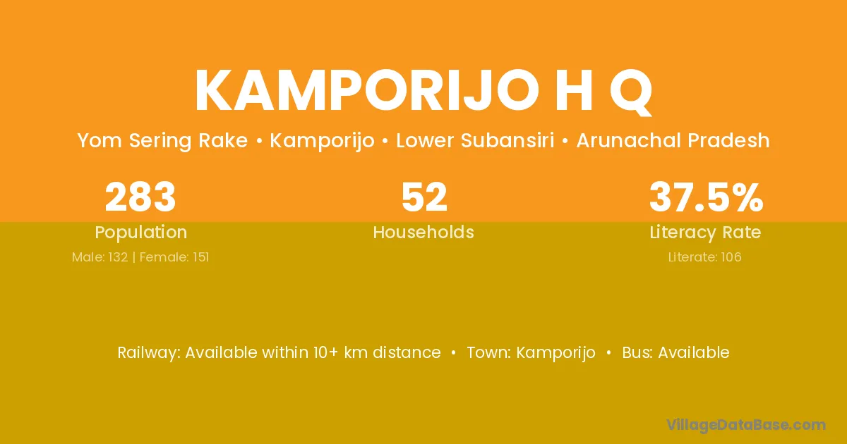 The literacy rate of Kamporijo H Q village is 37.46%. Male literacy stands at 37.12% and female literacy at 37.75%.