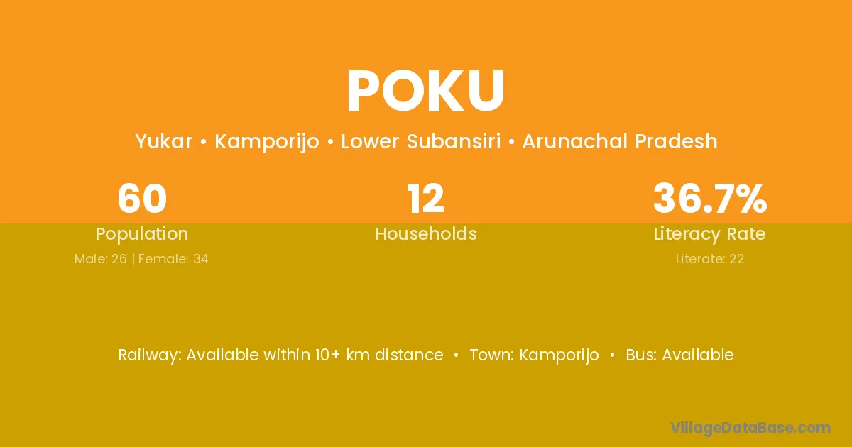 Poku village has a total population of 60 people, of which 26 are males and 34 are females.