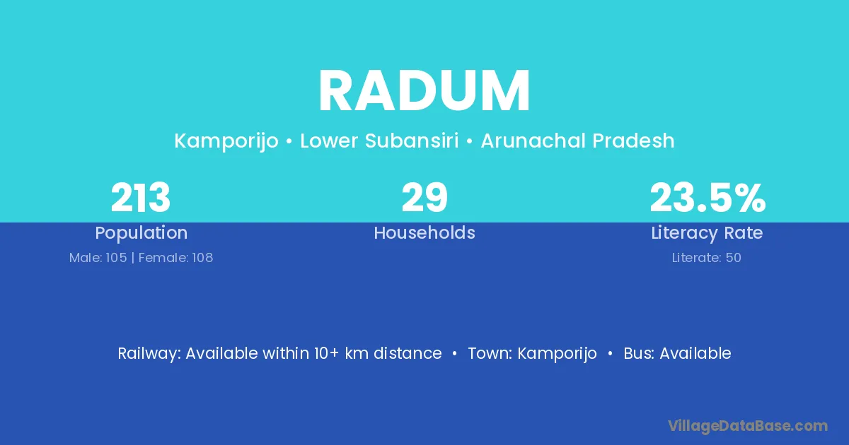 Radum village has a total population of 213 people, of which 105 are males and 108 are females.