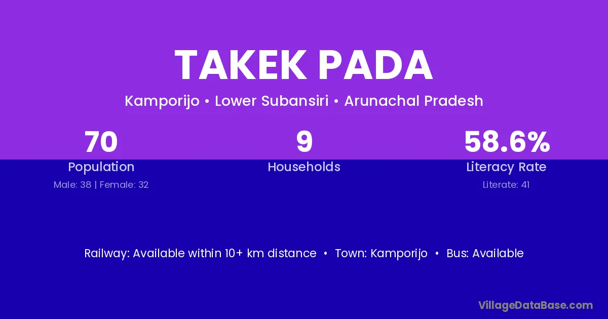 Takek Pada village has a total population of 70 people, of which 38 are males and 32 are females.