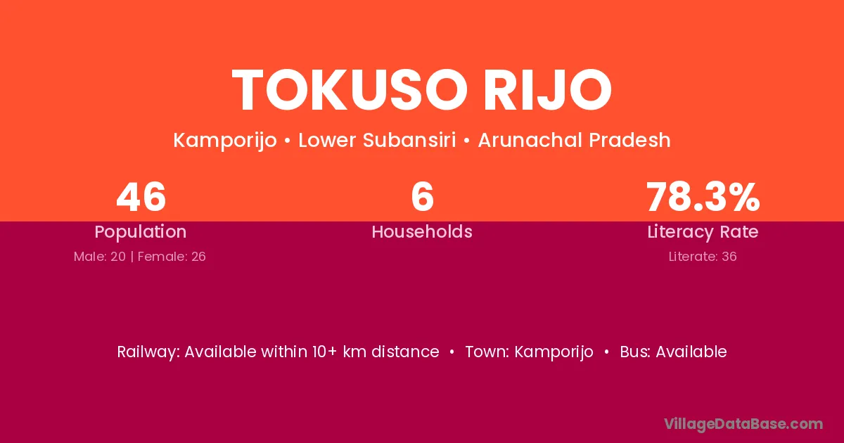 Tokuso Rijo village has a total population of 46 people, of which 20 are males and 26 are females.
