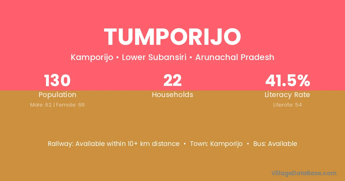 Tumporijo village has a total population of 130 people, of which 62 are males and 68 are females.