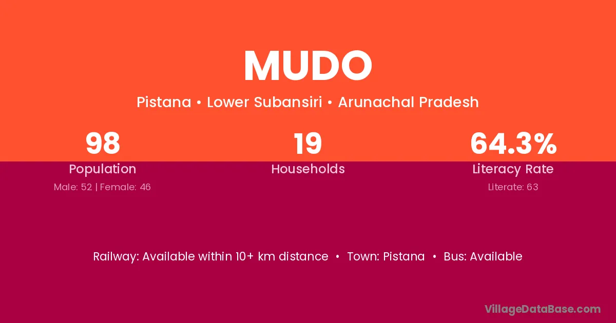 Mudo village has a total population of 98 people, of which 52 are males and 46 are females.